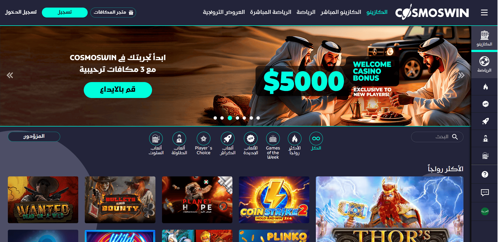 يضم Cosmoswin آلاف ألعاب السلوتس من أبرز المزوّدين، بالإضافة إلى ألعاب الطاولة مثل البلاك جاك والروليت والبكارا. كما يتوفر كازينو مباشر بجودة عالية يقدم أجواء واقعية مع موزعين محترفين.