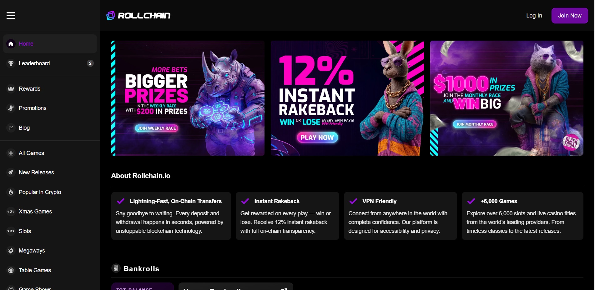 Rollchain هو كازينو عملات رقمية يقدم تجربة سريعة وواضحة بدون أي تعقيد. التسجيل يتم عبر محفظة العملات الرقمية مباشرة، والسحب فوري بدون انتظار.
